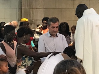 Moment particulièrement émouvant : la maman et la tante ont apporté le pagne d’ordination que portait le père Jean-Marie il y a vingt ans. Visiblement ému, ce dernier reste un instant immobile au pied du chœur. Il gardera ce vêtement sur l’épaule jusqu’à la fin de la messe !