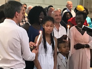 Pour le rite des offrandes, la famille chante un chant africain pendant que les enfants apportent les offrandes en procession.