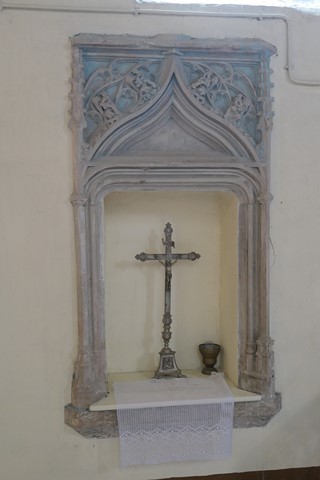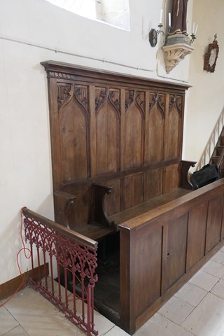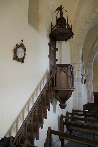On remarque une crédence ornementée (niche servant initialement à déposer tous les objets nécessaires à la célébration de l’Eucharistie : calices, patènes, ciboires, hosties, vin, eau et burettes), un travers-banc et une chaire dont l’exiguïté est adaptée à la taille de l’église.