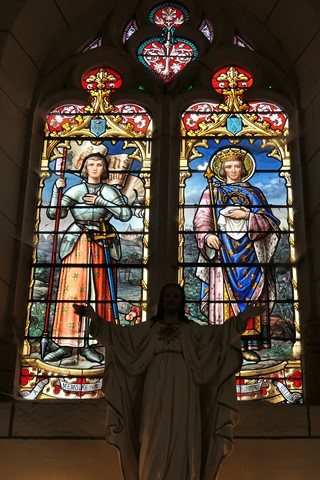 Le chevet plat est éclairé par deux vitraux très lumineux, consacrés à Jeanne d’arc et Louis IX.