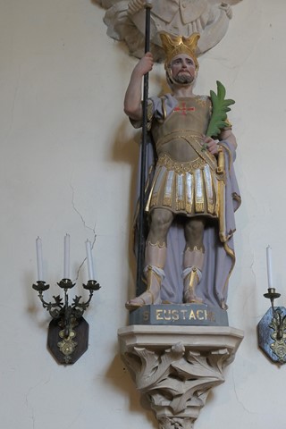 L’église de Champallement est dédiée à Saint Eustache, un général de l’armée romaine connu sous le nom d’ Eustathe ou d’Eustase qui aurait refusé d’exécuter l’ordre de procéder à des sacrifices au profit des idoles. Or Eustathe aurait poursuivi un troupeau de cerfs dans une forêt et, selon la légende, le plus grand portait une croix au sommet de ses bois et se serait présenté comme étant le Christ. Notre soldat se serait immédiatement converti, ainsi que son épouse et ses deux enfants. Ne pouvant lui faire abjurer sa foi chrétienne, les autorités le présentèrent, ainsi que sa femme et ses enfants, aux lions qui ne leur firent aucun mal, ce qui déplut à l’empereur qui les firent enfermer dans un taureau d’airain auquel on mit le feu. Leurs corps furent retrouvés intacts et ensevelis par les fidèles. Cette belle histoire n’est cependant pas approuvée par tous les historiens, certains estimant que cette légende aurait été inventée de toutes pièces, à des fins d’édification de la population. Quoi qu’il en soit, Saint-Eustache est représenté en soldat romain, porteur de la palme du martyre.