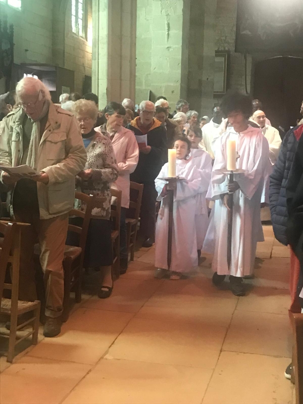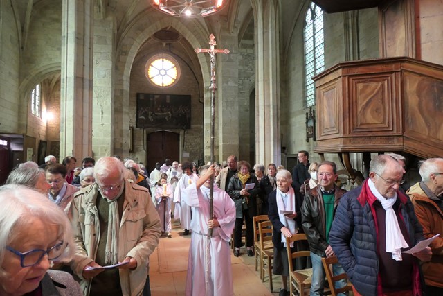 Belle procession en ce 27ème dimanche du temps ordinaire mais aussi fête de notre paroisse : les servants de messe marchent en tête, suivis de Patrick, le diacre de la paroisse, du père Ambroise, vicaire, du père Jean-Marie, curé, du père Michel (non visible sur la photo) et enfin du père François-Xavier REVENEAU, Vicaire Général du diocèse de Nevers. Tous ont revêtu l’aube blanche, symbole de fête, en l’honneur de Saint-François d’Assise. L’assistance chante : “Rendons gloire à notre Dieu.”