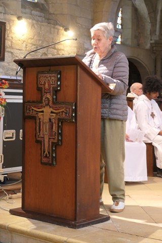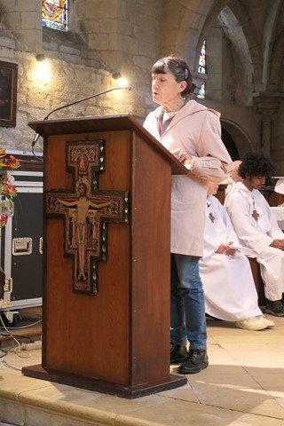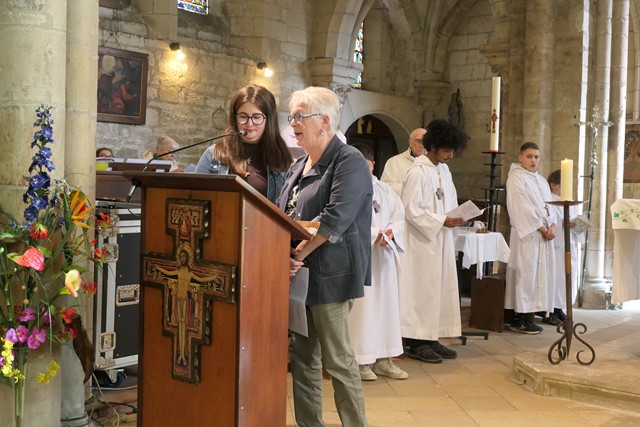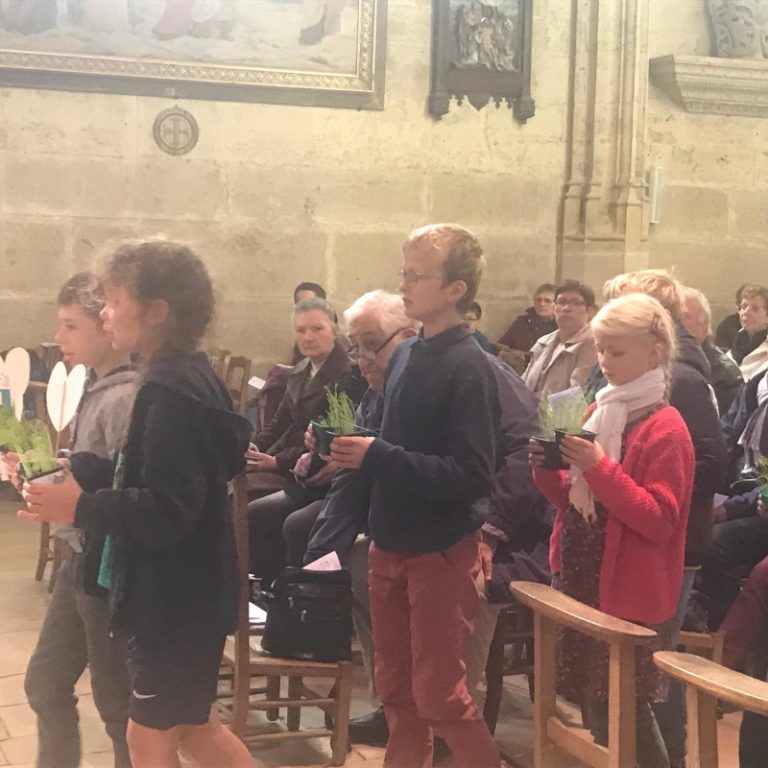 La prière universelle est récitée par Marine et Françoise. A l’Offertoire, des jeunes apportent des symboles de la Création chère à Saint-François.