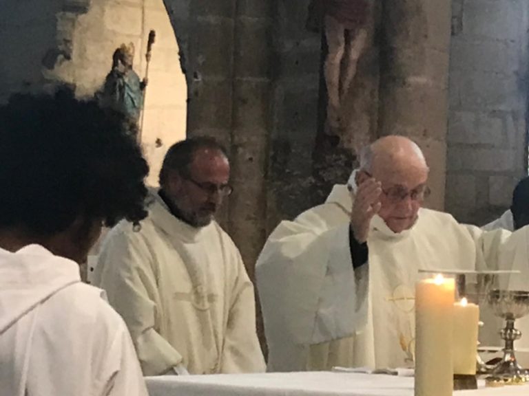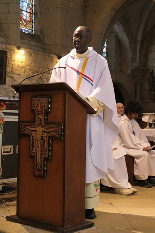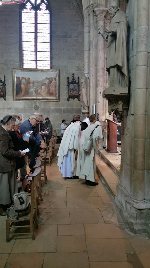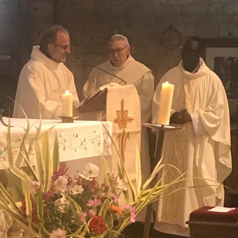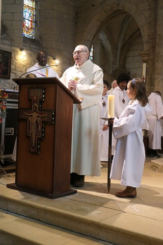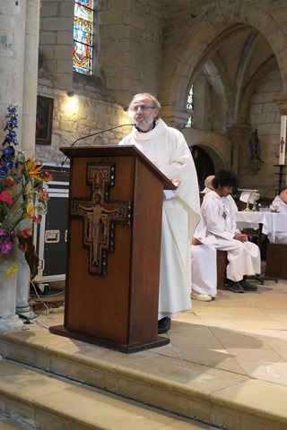 L’homélie est prononcée par le père François-Xavier : “Jésus-Christ doit témoigner de l’amour de Dieu qui vient mais il a besoin de la parole de Paul, ce dernier devenant le témoin du Christ. Paul a donné sa vie pour servir le monde nouveau, il est en union intime avec le Christ. Un autre grand saint est Saint-François d’Assise : la réussite étant à sa porte, il a choisi un autre idéal, teinté de romantisme : plutôt que le monde nouveau des riches marchands, il a découvert au travers des épreuves la réalité de Jésus-Christ : sa rencontre avec le lépreux, les chevaliers revenant de terre sainte : il découvre la lumière nouvelle de l’Evangile : Jésus crucifié, ressuscité, rentrait dans son cœur. Il s’est mis à rebâtir une petite église, à être proche des humbles, de tous les petits.