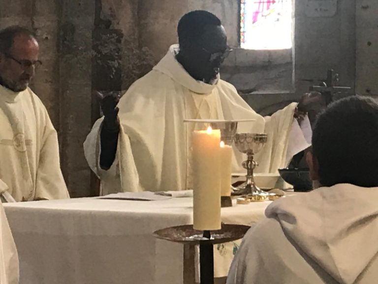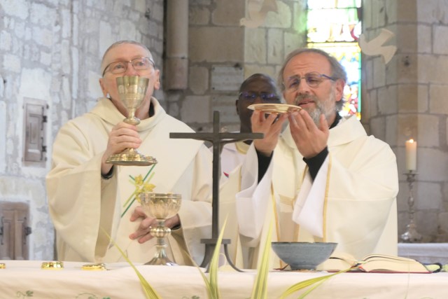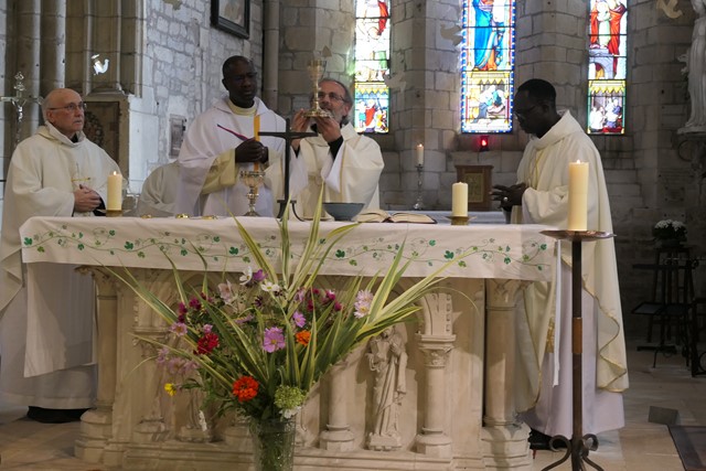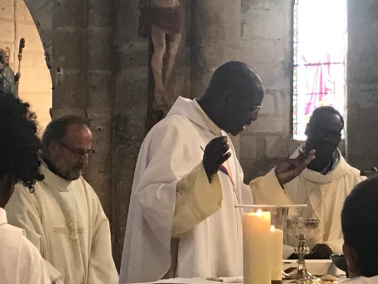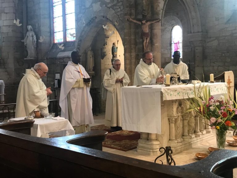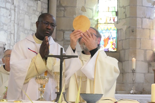Entouré des concélébrants, le père François-Xavier élève l’hostie puis le vin qui sont consacrées en Corps et Sang du Christ. La Liturgie Eucharistique se poursuit avec les prières prononcées par les 3 concélébrants. La doxologie marque la fin de la Prière Eucharistique. En ce jour de fête, le grand Amen est chanté par l’ensemble des fidèles.