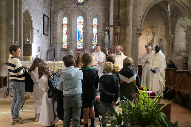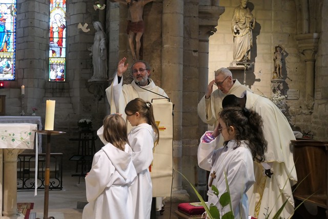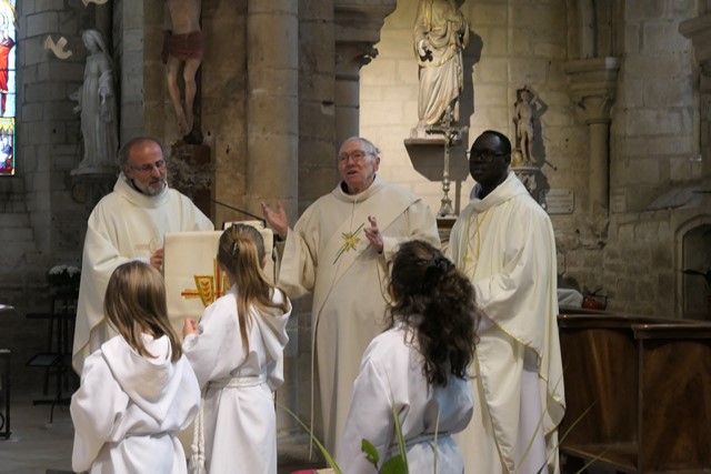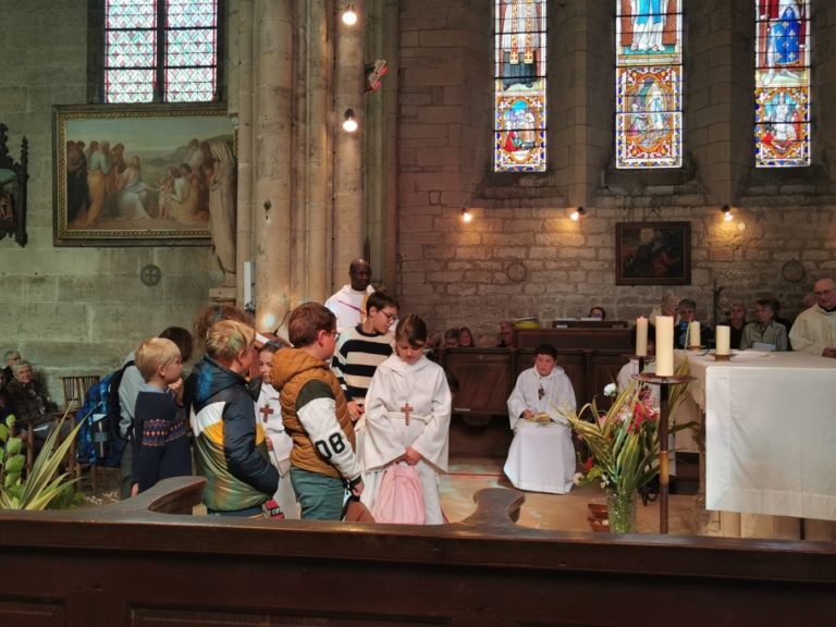 Puis le père François-Xavier invite les enfants à rejoindre le chœur et procède à la bénédiction de leurs cartables, afin que l’année scolaire soit la meilleure possible pour eux.