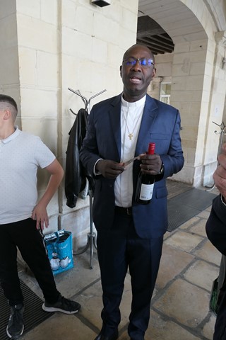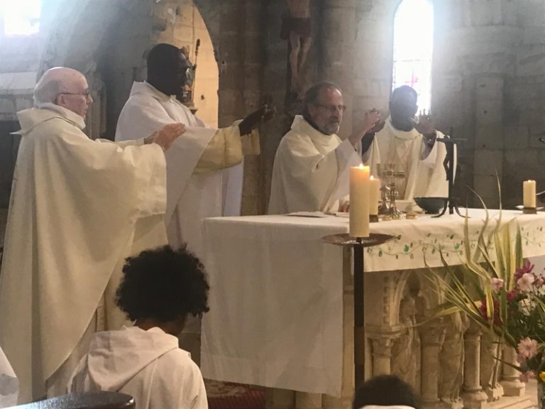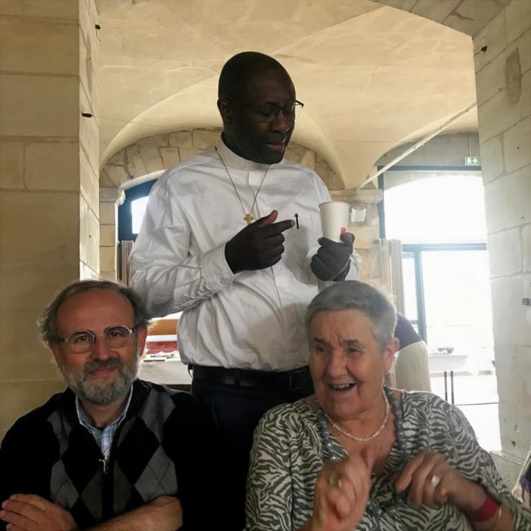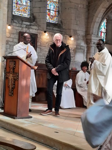 Le père Jean-Marie accueille maintenant les nouveaux arrivants de l’année : Xavier ROUARD et le père Ambroise GNING, notre nouveau vicaire.