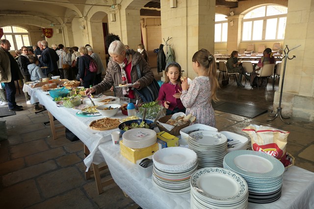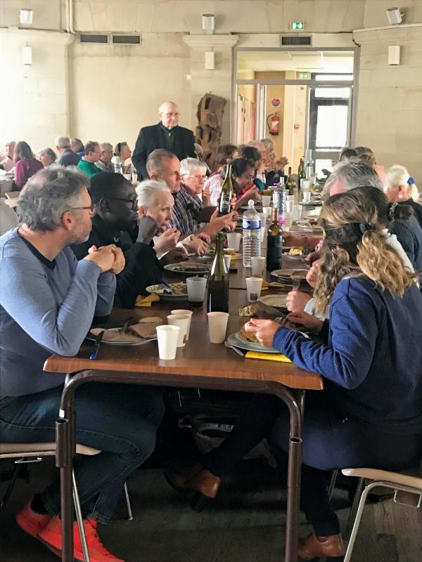 Le père Jean-Marie demande un instant de silence pour que chacun puisse chanter le benedicite puis c’est le moment tant attendu de se diriger vers le buffet bien garni de ce que les paroissiens ont apporté.
