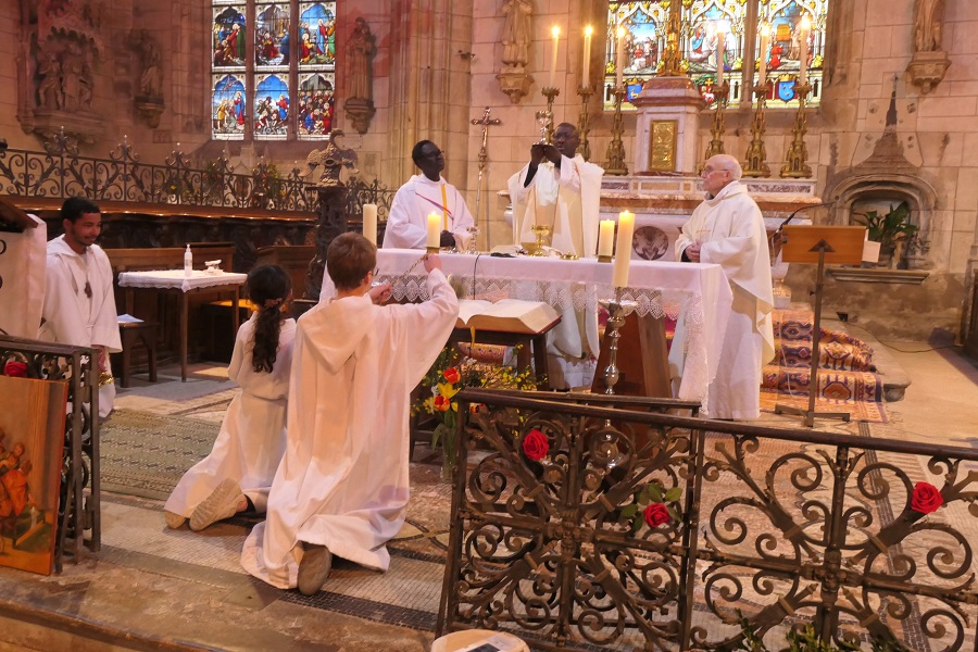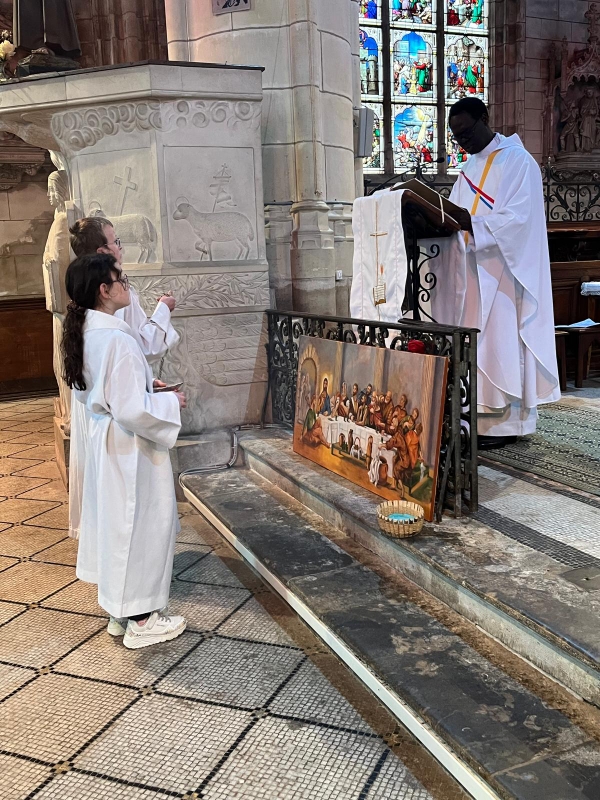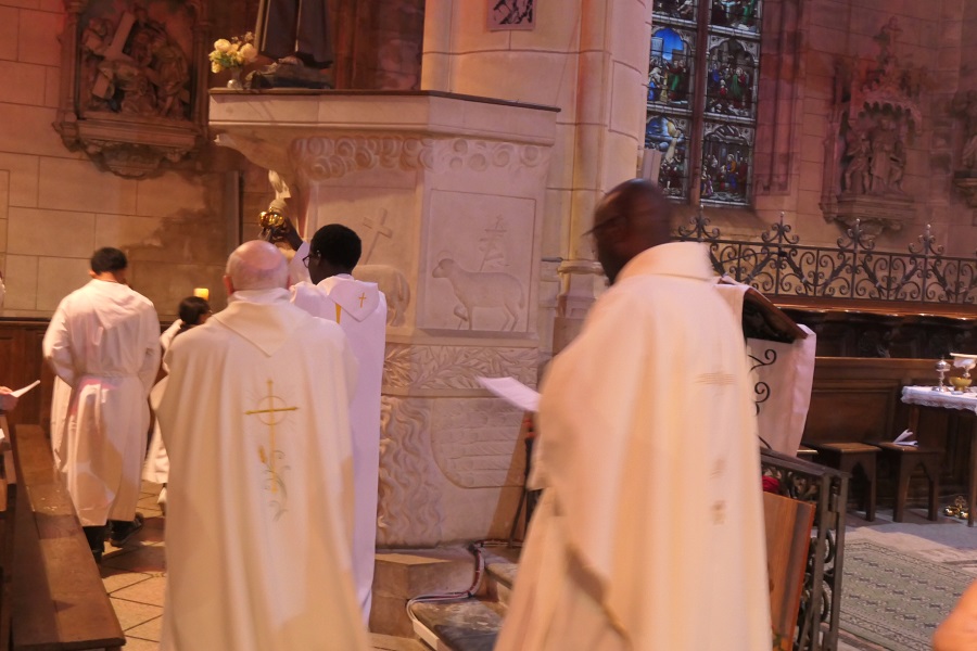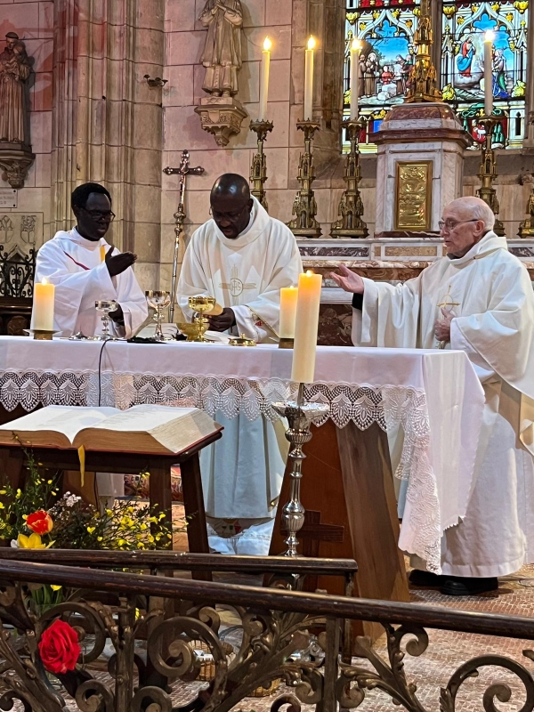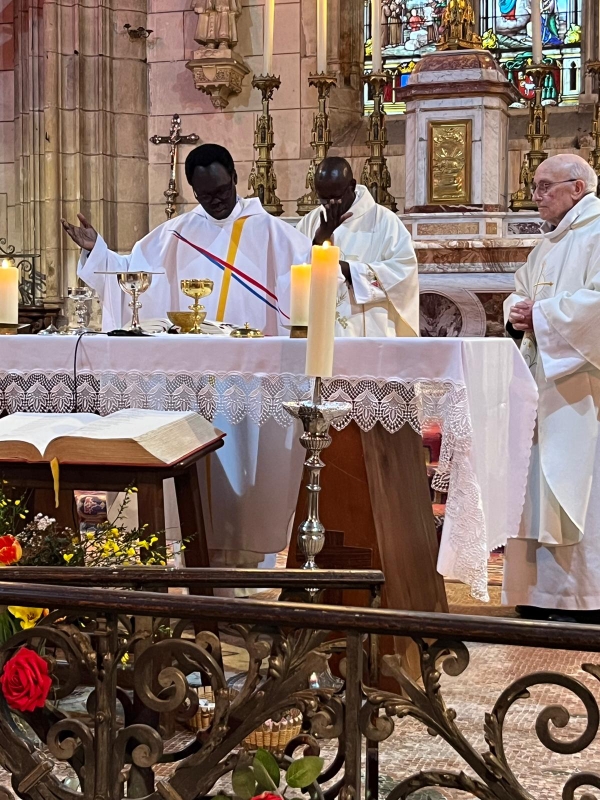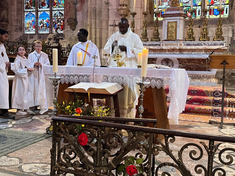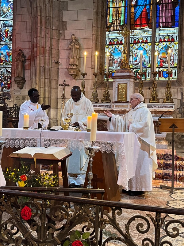 Notre assemblée était réunie autour de nos 3 prêtres, le père Jean-Marie DIOUF, curé présidant la célébration, le père Ambroise GNING, vicaire, et le père Michel GUYOT, prêtre auxiliaire, tous deux concélébrants, en l’honneur de la fête sacerdotale commémorant l’Institution de l’Eucharistie.