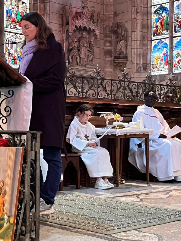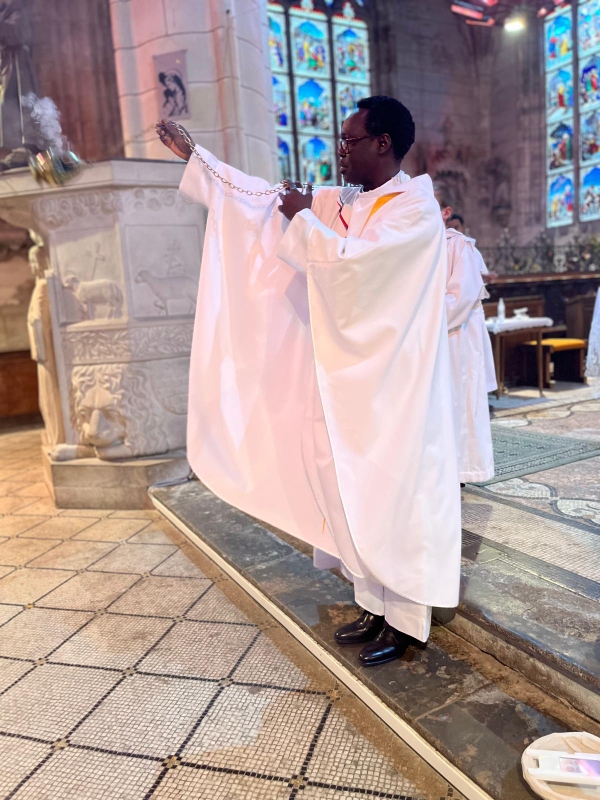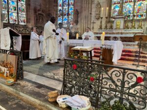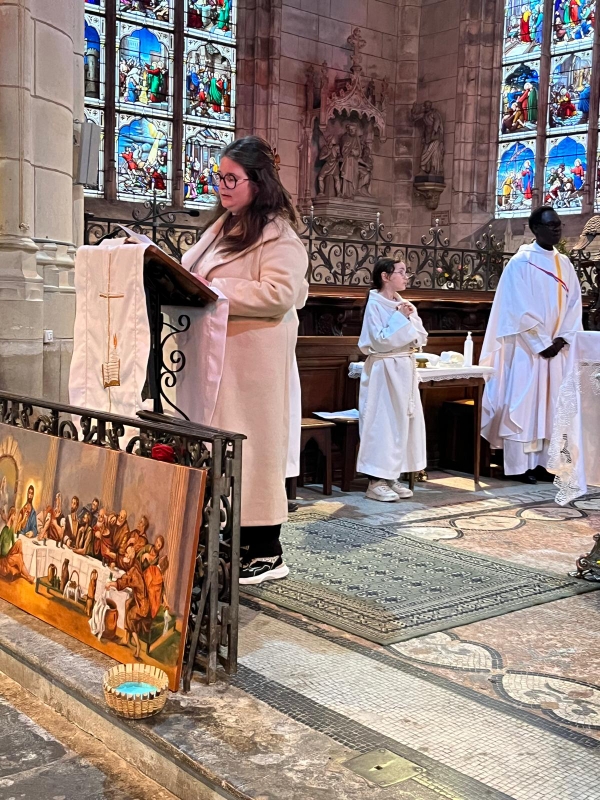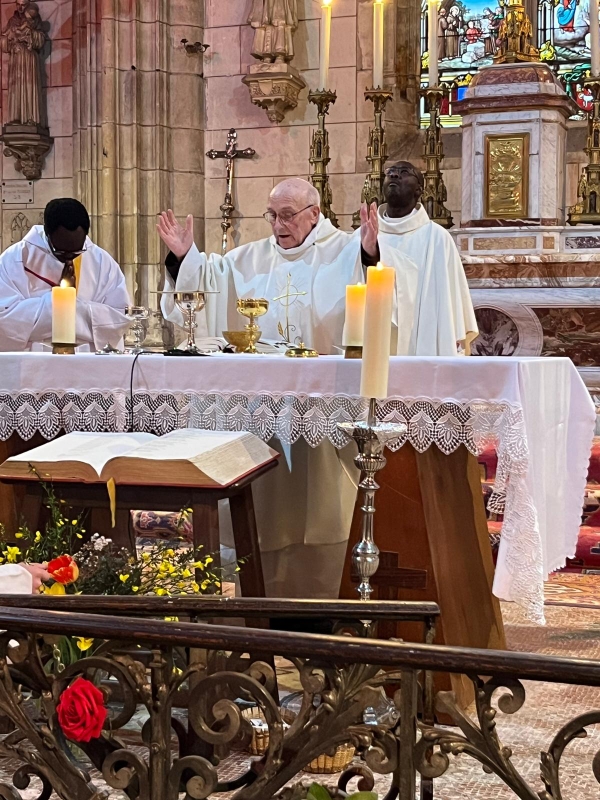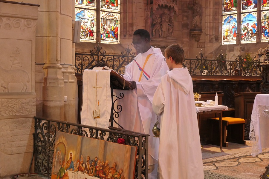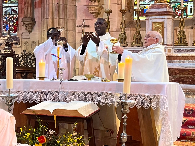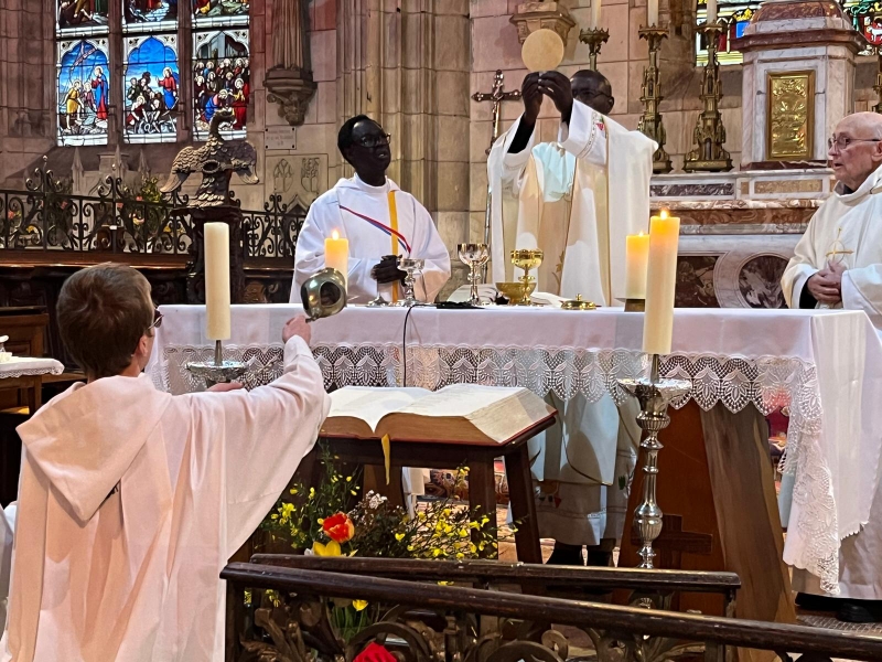 Notre assemblée était réunie autour de nos 3 prêtres, le père Jean-Marie DIOUF, curé présidant la célébration, le père Ambroise GNING, vicaire, et le père Michel GUYOT, prêtre auxiliaire, tous deux concélébrants, en l’honneur de la fête sacerdotale commémorant l’Institution de l’Eucharistie.