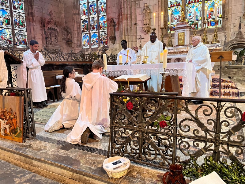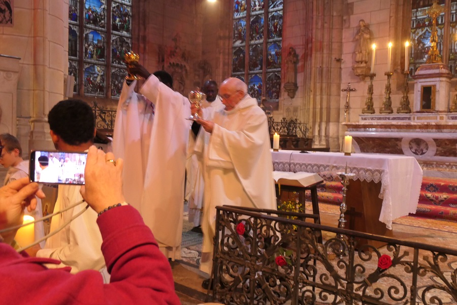 Après l’Offertoire, l’encensement des oblats et de l’assemblée des fidèles, la Liturgie Eucharistique prend tout son sens lors de la Concélébration de nos trois prêtres qui commémorent ensemble l’Institution de l’Eucharistie par la Consécration du pain et du vin, selon les paroles mêmes que le Christ a confié à ses Apôtres : « Faites ceci en mémoire de moi. »
