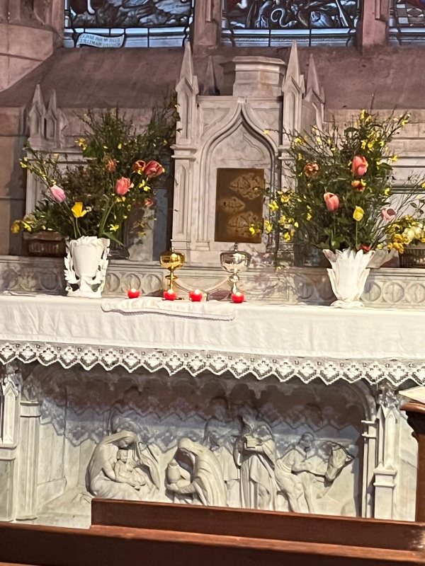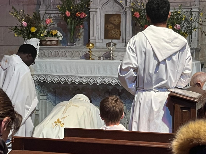 La liturgie du Jeudi Saint se prolonge dans une atmosphère de dépouillement. Après la messe « en mémoire de la Cène du Seigneur », le Saint-Sacrement est déposé au reposoir, l’autel est dépouillé : tout exprime l’entrée du Christ dans sa Passion.