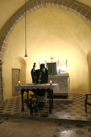La doxologie clôt la Liturgie Eucharistique. Le chœur en cul de four n’est éclairé que par un petit vitrail bleu qui est à peine visible, caché par le tabernacle.
